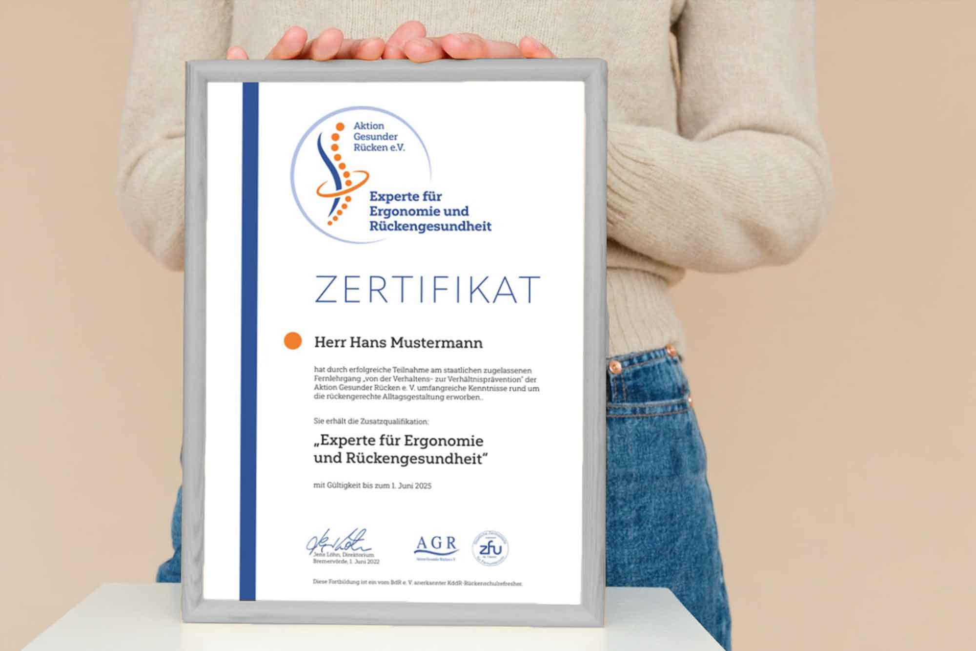 Nach Bestehen der Prüfung erhalten Sie ein bundesweit anerkanntes AGR-Zertifikat mit dem Titel „Experte bzw. Expertin für Ergonomie und Rückengesundheit“.