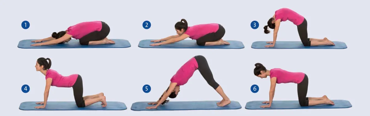 (1) Starten Sie im Fersensitz, legen dann den Brustkorb auf die Oberschenkel, die Stirn auf die Matte und strecken die Arme nach vorne aus. (2) Strecken Sie beim Einatmen die obere Wirbelsäule, heben den Brustkorb und Kopf an, der Nacken ist gestreckt. (3) Gehen Sie beim Ausatmen in den Vierfüßlerstand und machen einen Katzenbuckel. (4) Senken Sie beim anschließenden Einatmen den mittleren Rücken so weit ab, bis Sie ins Hohlkreuz gehen, der Brustraum weitet sich. (5) Nur für Fortgeschrittene: Stellen Sie beim Ausatmen die Füße auf und nehmen Sie die Position des herabschauenden Hundes ein. Achten Sie dabei auf die Dehnung des Rückens und lassen Sie die Beine gebeugt, wenn es sich besser anfühlt. Halten Sie die Position für einige Atemzüge. (6) Dann die Knie zum Boden bringen und in den Vierfüßlerstand gehen. Beginnen Sie die Übung nun von vorne und wiederholen Sie sie 5-mal.