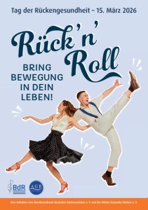 4 | Aktion Gesunder Rücken e.V. - Gemeinsam für ein Rücken-gesundes Leben Das Motto zum Tag der Rücken- gesundheit 2026: Rück’n’Roll – Bring Bewegung in dein Leben! Das Motto steht nicht alleine für Aktivität – es ist ein Lebensgefühl. „Rück’n’Roll“ verbindet rückenfreundliche Bewegungsförderung mit dem Schwung und der Energie von Rock’n’Roll: Es geht darum, Bewegung wieder ganz selbstverständlich in deinen Alltag zu integrieren und deinen Körper in einen gesunden Rhythmus zu holen: Schritt für Schritt in ein bewegteres, rückenfreundlicheres Leben. Warum Tanzen gut für einen gesunden Rücken ist Tanzen macht Spaß! Aber wusstest du, dass Tanzen auch eine hervorragende Aktivität für Rückengesundheit und Schmerzprävention ist? Beim Tanzen werden Kraft, Ausdauer und Beweglichkeit gleichzeitig trainiert, ganz ohne langweilige Wiederholungen. Die rhythmischen Bewegungen stärken die Rumpf- und Rückenmuskulatur, fördern Koordination, Gleichgewicht und Körperwahrnehmung und wirken so Rückenproblemen langfristig entgegen. Gleichzeitig verbessert Tanzen die Haltungsstabilität und hilft, Verspannungen und Schmerzen vorzubeugen, weil viele Muskelgruppen gleichmäßig aktiviert werden. Das Thema „gesundheitsfördernde Bewegung“ steht im Mittelpunkt des 25. Tag der Rückengesundheit, der unter dem Motto „Rück’n’Roll – Bring Bewegung in dein Leben!“ bundesweit darauf aufmerksam macht, wie regelmäßige Alltagsbewegung Rückenschmerzen vorbeugen und die Lebensqualität verbessern kann. Expertinnen und Experten geben rund um diesen Aktionstag wissenschaftlich fundierte Tipps und veranstalten Aktionen zur Rückenschmerzprävention durch Bewegung. Tanzen für den Rücken: ganz einfach, für alle Altersgruppen und Fitnesslevels. Ob klassisch, modern oder individuell, bewegt euch mit Spaß und Musik für einen gesunden Rücken!